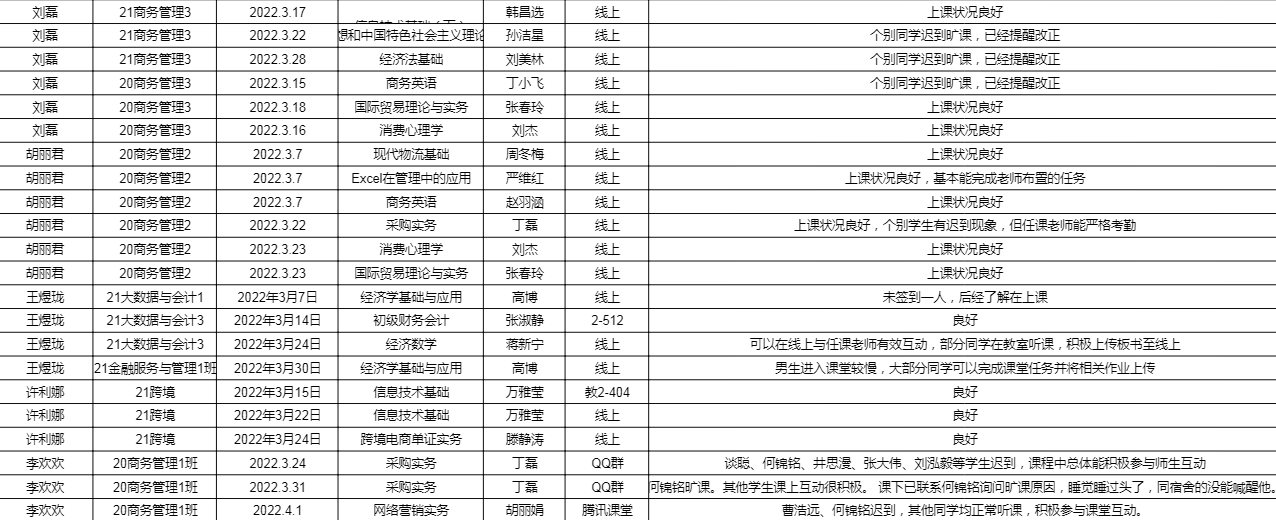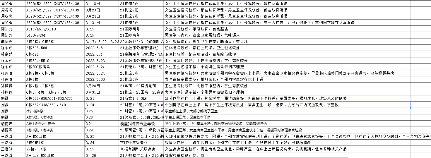 自从线上教学开始后,星空平台学工团体积极做好工作台账,将每日巡查宿舍情况、线上课堂检查情况、与学生的谈心谈话过程记录在册,通过动态的对比发现学生在这段时期内学习生活上的问题,积极督促改进。同时,结合防疫政策,每天认真汇总学生的体温日报,按比例通知学生按时参与核酸检测,为全校学生的身体健康提供保障。在此期间,也不可避免的出现有学生违反校规校纪、不遵守防疫规定的情况,比如私自外出、核酸漏检等,对于这些学生,学院以教育为重,及时进行批评处分,保证学院、学校的防疫大局。