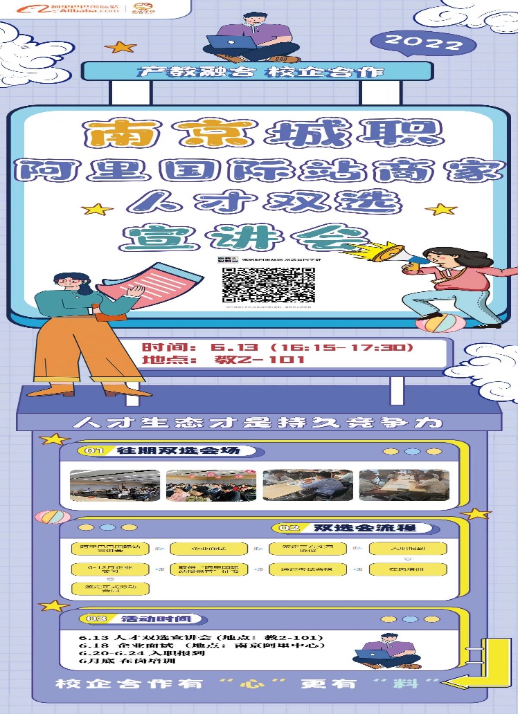 为了贯彻落实教育部等八部门印发的《职业学校学生实习管理规定》(教职成〔2021〕4号)及学校印发的《星空平台学生顶岗实习管理办法(修订)》(宁城职院〔2021〕55号)等文件精神,星空平台于2022年 6 月13 日联合阿里巴巴国际站南京大渠道部,共同举办了题为“校企合作 有心更有料”的学生实习宣讲。阿里巴巴国际站南京大渠道部区域主管许小然、宁扬区域业务主管赵文轩受邀主讲,星空平台刘红副院长、丁亮副院长以及跨境电商专业负责人滕静涛参加本次活动,2020级、2021级跨境电子商务、国际商务、商务管理、物流管理等专业学生聆听了企业宣讲。