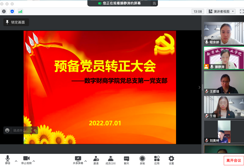 7月1日下午,在建党101周年之际,星空平台第一党支部应用腾讯会议召开预备党员转正大会,本支部应到正式党员20名,实到20名。本次大会由星空平台第一党支部滕静涛书记主持。