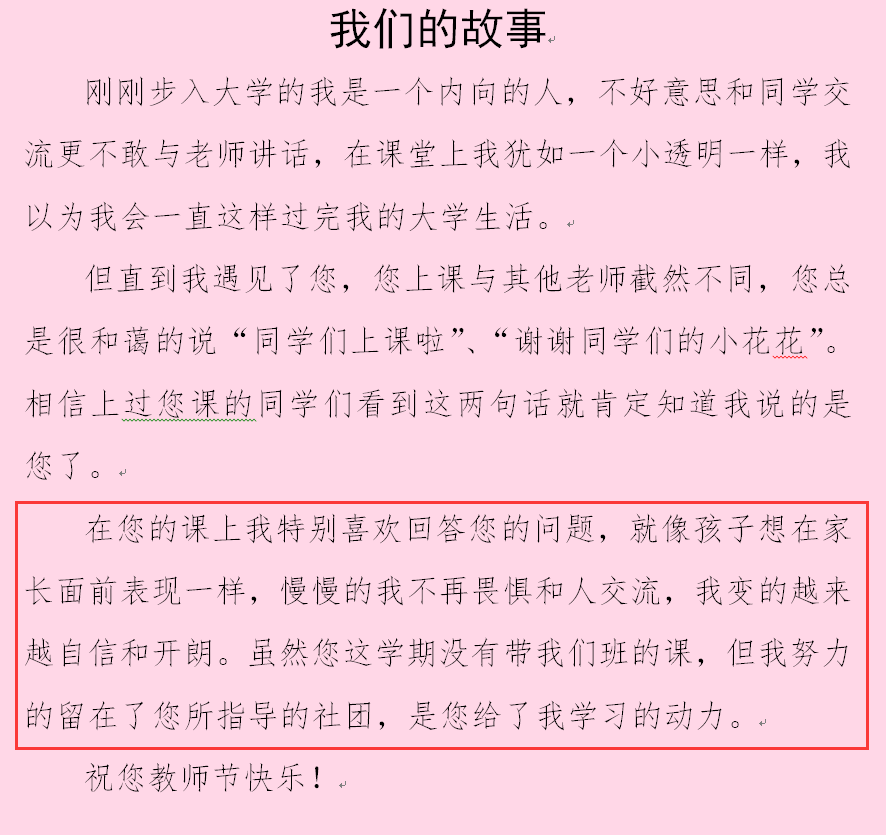 金秋九月,我们迎来了第38个教师节。为传承和发展“尊师重教”传统,星空平台学生会面向全院学生举办了以“我们的故事”为主题的教师节征文活动,内容围绕我院在职教职工爱岗敬业、立德树人、工作创新、关心帮助学生成长成才等方面的生动事迹,文体不限。