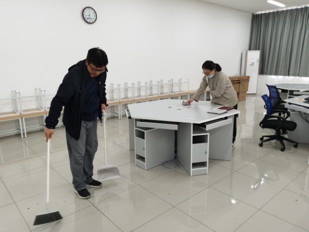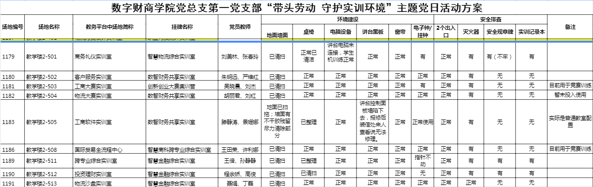活动前,支委会专门开会研究了活动方案,在超星支部网络党课中发布通知。当天,支部书记主持召开在线会议强调活动意义和要求。本次劳动组织以小组包干负责制的形式开展,每组2名教师党员,共9组。每组完成对溧水校区厚生楼5楼实训室的环境卫生保养及安全隐患专项检查,活动成果如下表所示。党员教师们带领入党积极分子,对9个实训室进行卫生打扫、调整桌椅、检查电脑设备、进行相关的安全排查,并把劳动所得信息整理成表格,以便后续反馈给相关部门加强对实训室的管理。