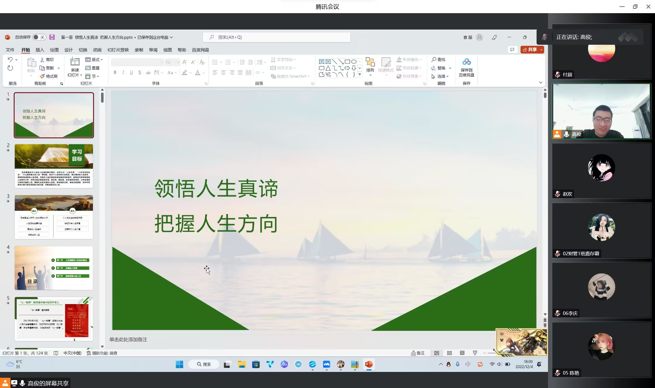 高老师以问题互动的形式切入,得到了同学们的积极回应:什么是人生观、价值观以及世界观?人生观即人为什么活着、人应当如何活着、什么样的人生才有价值,世界观是人生观的理论基础,它给人生观提供一般观点和方法的指导;人生观是世界观的一个方面,是世界观在人生问题上的应用和贯彻。只有在一定的哲学世界观基础上形成的人生观,才是自觉的人生观。世界观还是形成价值观的基础,世界观不同,价值观也就不同。高老师还介绍,黄文秀的入党申请书中写道:“一个人要活得有意义,生存得有价值,就不能光为自己而活,要用自己的力量为他人、为国家、为民族、为社会作出贡献。”作为新时代的青年,我们也应树立正确的人生观,过有价值的人生。