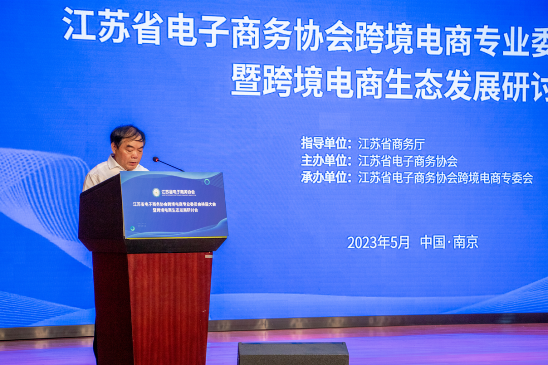 省电商协会会长高成祥到会致辞,肯定了协会跨境电商专委会成立5年来的成果,高频次、高规格举办行业活动、推动传统制造业提档升级、助推全省跨境人才队伍建设等;他介绍了全省跨境电商良好的发展态势和相关利好政策,重点解读了相关部门关于发展跨境电商重点行动方案的实施和推进。最后高会长指出,希望跨境电商专委会以本次换届为契机,不断创新服务理念,拓展服务领域,加强平台合作,推动更多的企业做大规模,吸引更多头部企业落户江苏,推动全省跨境电商发展跨上一个新台阶。
