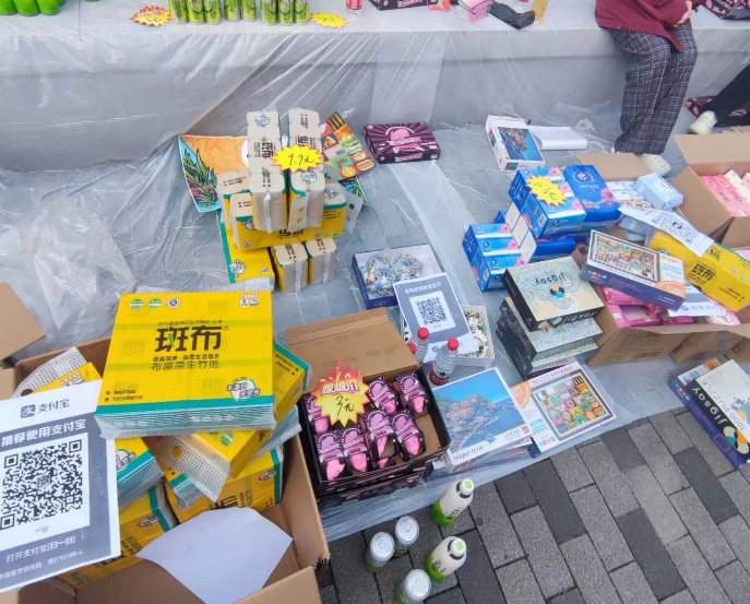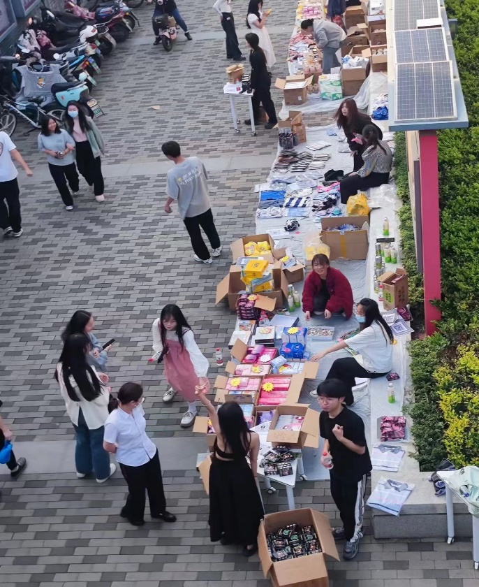 2023年5月25日下午3:30的食堂门口,十几位同学正在练摊,走近一问原来是跨境电商社团的社员们在进行实践活动。