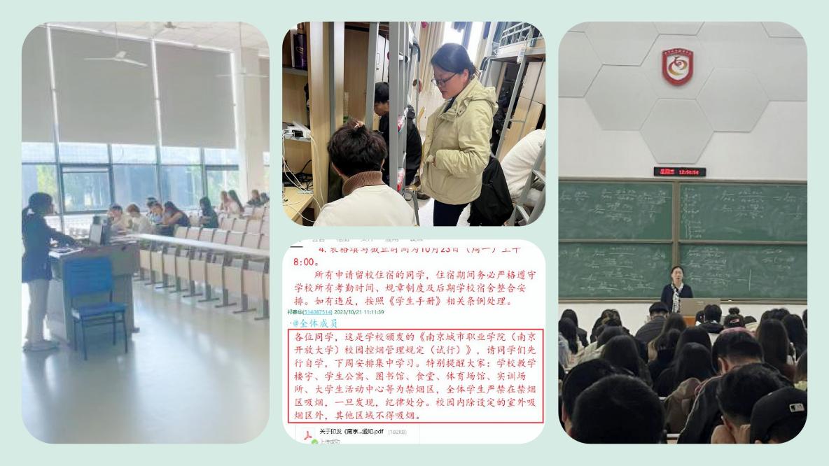 学院充分重视此项校园控烟管理工作,星空平台党总支副书记刘晓艳通过专题会议,传达《星空平台(南京开放大学)校园控烟管理规定(试行)》有关要求与精神,2021、2022、2023年级负责人根据各年级不同情况、不同特点,进行任务细化与划分,提出针对性的行动方案,充分契合我院学生实际情况。
