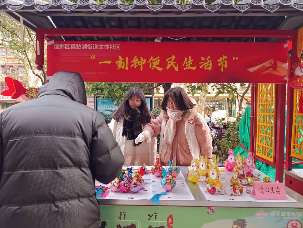 启动仪式结束后,同学们来到互动实践区开展志愿服务。这里有秦淮灯彩、金银细工、彩绘脸谱、六合老鹅等非遗产品,也有青少年手工制作的竹编画、泥塑、布包等文创产品。大家的热心展示与爱心义卖,吸引了参与活动的嘉宾、社区居民和过往行人驻足观看。