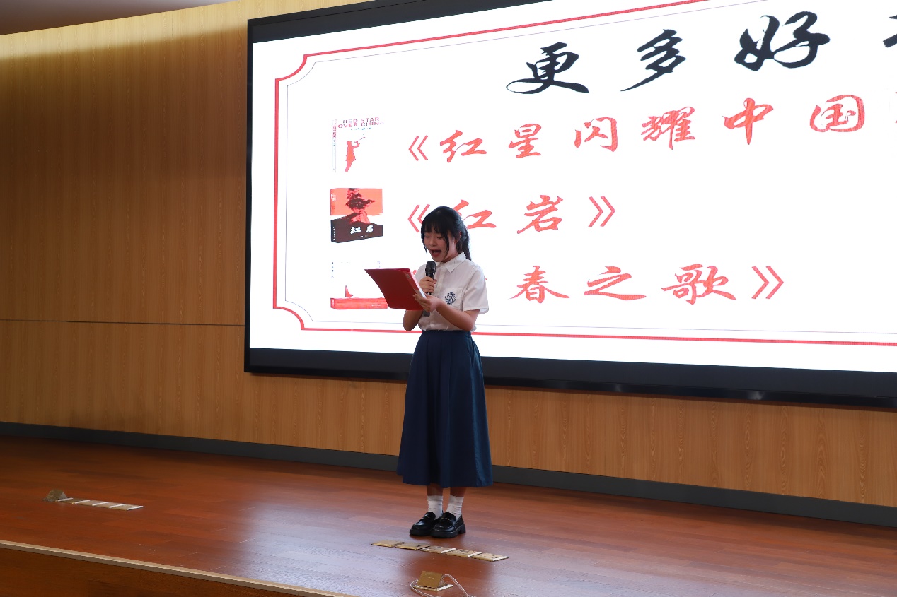 入团仪式结束后,由砺行读书会主办的好书推荐会随即展开。倪蓉蓉同学上台向新团员们推荐了《觉醒年代》一书。她详细介绍了书籍的内容、主题和时代背景,同时又推荐了《红星闪耀中国》《红岩》《青春之歌》等优秀经典书籍,鼓励新团员们通过阅读这本书深入了解历史,感悟时代精神,激发爱国热情,坚定理想信念。