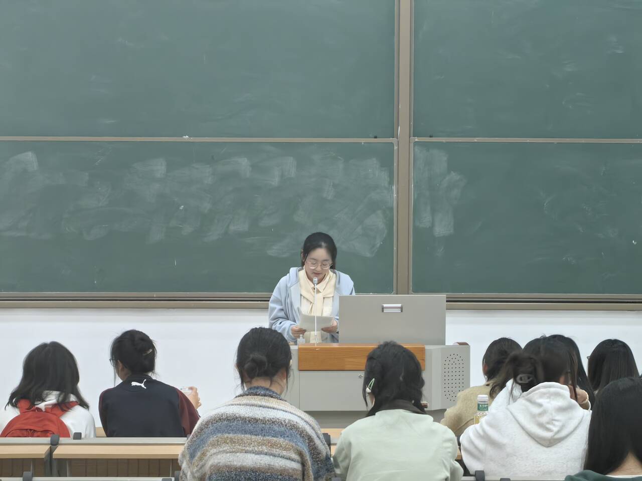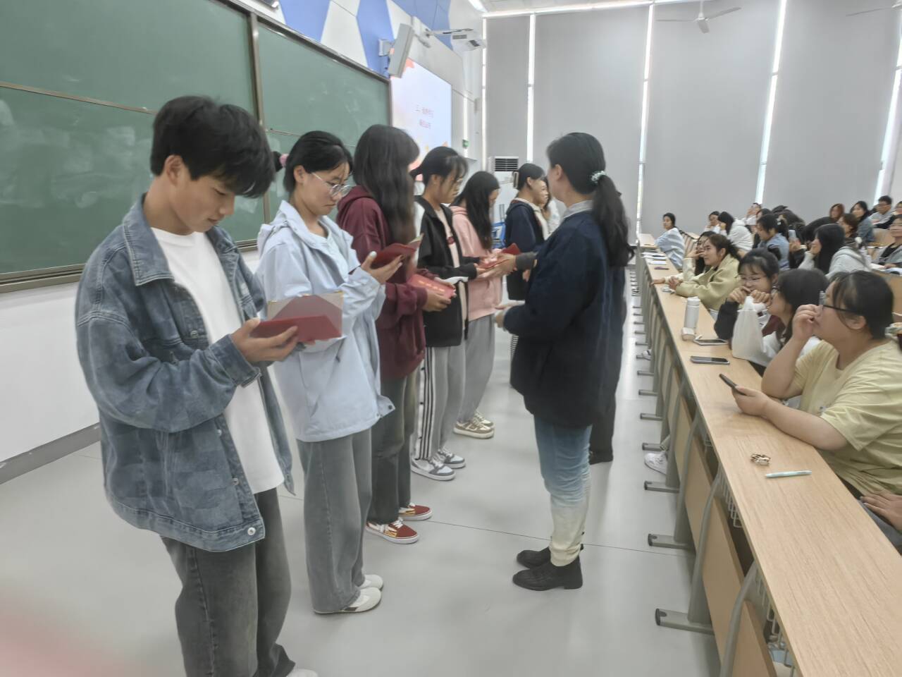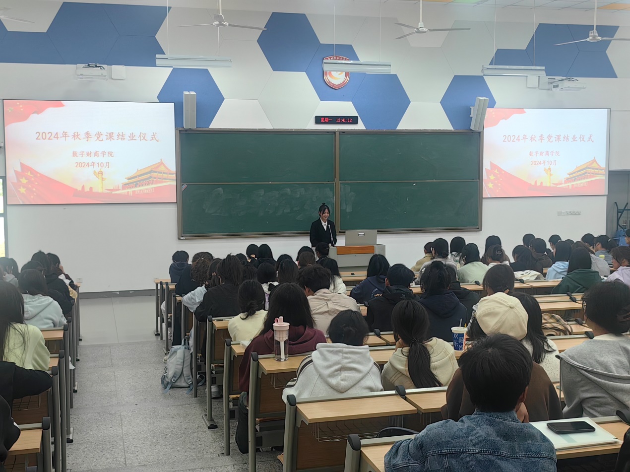 第三项议程进行优秀学员表彰,主持人宣读了在本次党课学习期间涌现出的十位优秀学员名单,由参会党员老师颁发优秀学员证书并合影留念。第四项议程请优秀学员代表发言,来自24级商务与数据分析班级的优秀学员代表胡妍与大家分享了在党课学习过程中的所学、所思、所想。她表示通过党课不仅学习了党的发展历程,更让自己更加坚定了为党、为人民、为共产主义事业奋斗终生的决心和信念;将更加认真学习这些科学理论,努力做到不仅在思想上入党,更要尽自己的所能去帮助他人,会时刻以党员的要求来要求自己,不断完善自己。