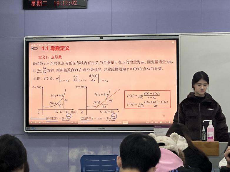 此次活动以“走进导数世界,领略数学之美”为主题,旨在深化同学们对导数的理解,激发对数学学科的兴趣与热爱。导数作为微积分的重要组成部分,不仅在数学领域内占据举足轻重的地位,更在物理、工程、经济等多个领域发挥着不可替代的作用。社长首先组织观看了一段关于导数的视频,深入浅出地讲解了导数的定义、性质及其在实际问题中的应用,通过生动的案例与有趣的数学故事,将抽象的数学概念变得生动有趣,引得在场听众频频点头。随后,同学们围绕导数相关问题进行练习和讨论,大家在轻松愉快的氛围中加深了对导数的理解。此外,社团还组织了一系列趣味盎然的互动环节,包括导数知识竞赛、数学游戏等。这些活动不仅加深了同学们对导数知识的记忆,还培养了他们的团队协作能力和数学思维能力。