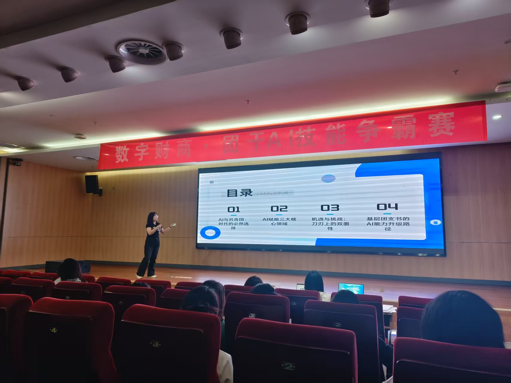 2025年4月16日,星空平台分团委在图书馆报告厅成功举办了以“AI相伴,强技砺行”为主题的团干技能大比武活动。本次活动旨在通过学生的演讲与展示,激发学生在人工智能时代不断提升自我能力、强化技能训练,并加强团组织的凝聚力与向心力。本次活动吸引了各班团支书积极参与,每位团支书根据主题“AI相伴,强技砺行”精心准备了PPT,并在规定时间内进行演讲展示。演讲内容涵盖了人工智能的基础知识、AI在日常学习中的应用、AI与未来职业发展的关联以及如何通过AI工具提升自我技能等方面。