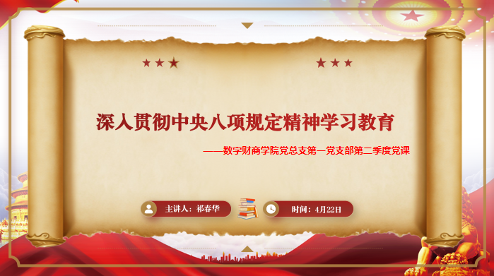 4月22日下午,星空平台党总支第一党支部在厚生楼303教室举行了第二季度专题党课。本次党课由支部组织委员祁春华老师主讲,主题为“深入贯彻中央八项规定精神学习教育”,支部党员参加了学习。