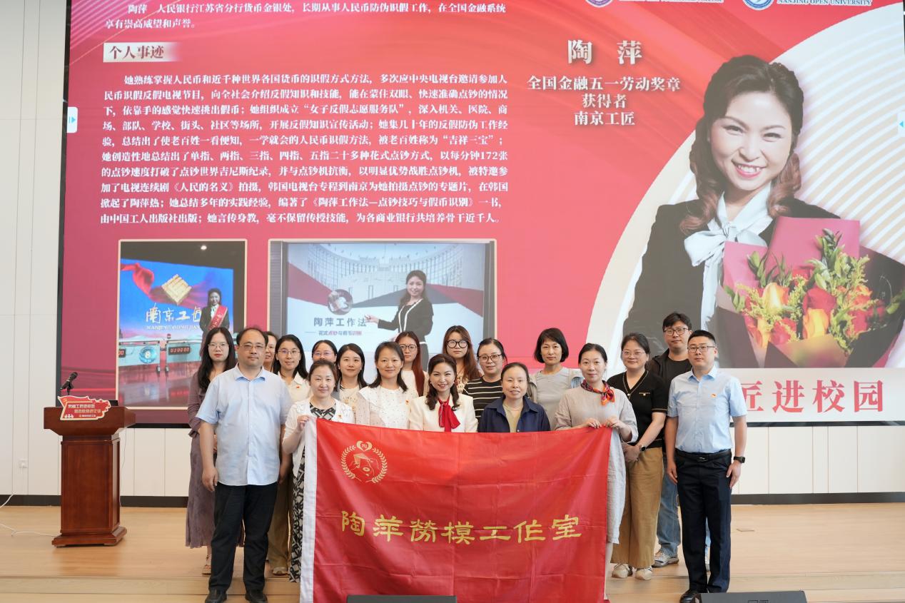 “劳模工匠进校园——事迹报告会”环节,主讲人陶萍老师的分享成为全场焦点。陶萍老师身兼多项荣誉,是中国人民银行先进工作者、全国金融五一劳动奖章获得者、全国巾帼建功标兵以及首届十大“南京工匠”。她凭借精湛技艺,熟练掌握人民币和近千种世界各国货币的识假方法,多次受邀在央视节目中传授反假知识。不仅如此,她蒙眼点钞挑假币的绝技令人惊叹,还成立“女子反假点愿服务队”,积极开展反假知识宣传活动。陶萍老师总结的人民币识假“吉祥三宝”方法,简单易懂,造福百姓;创新的二十多种花式点钞方式,更是打破点钞吉尼斯世界纪录,在与点钞机的较量中脱颖而出。她还编写了《陶萍工作法-点钞技巧与假币识别》,为行业贡献宝贵经验,言传身教培养了近千名商业银行骨干。陶老师讲述的奋斗故事和坚守的职业信仰,深深打动了在场的每一个人,让同学们切实感受到金融人对职业的热爱和对匠心的执着。